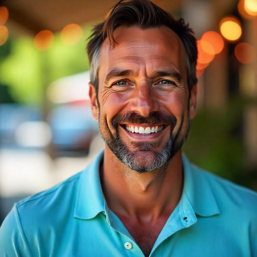 A confident man in his late 50s, light olive skin, short salt-and-pepper hair, clean-shaven, wearing a casual button-down shirt and slacks. Standing in a sunny urban area in Los Angeles with palm trees in the distance. He’s smiling naturally, expressing pride in his healthier smile. Bright daylight, photorealistic, candid lifestyle image.